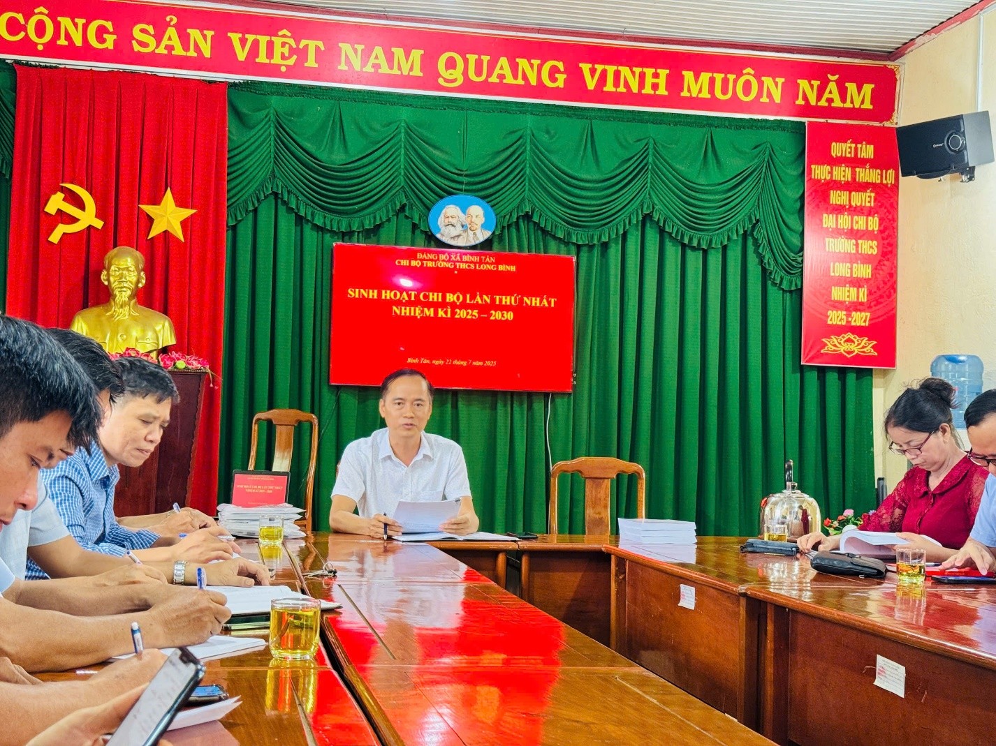 Chi bộ đã thực hiện những nội dung quan trọng: Thông qua Quyết định số 40-QĐ/ĐU ngày 11/7/2025 của Ban chấp hành Đảng bộ xã Bình Tân về việc thành lập Chi bộ Trường THCS Long Bình và Quyết định số 100-QĐ/ĐU ngày 14/7/2025 của Đảng ủy xã Bình Tân về việc chỉ định tham gia Chi ủy, Phó Bí thư Chi bộ Trường THCS Long Bình thuộc Đảng bộ xã Bình Tân, nhiệm kỳ 2025 – 2030; Bàn giao công tác lãnh đạo Chi bộ của Chi ủy nhiệm kỳ 2025 – 2027 cho Chi ủy nhiệm kỳ 2025 – 2030; Thông qua phân công nhiệm vụ cho Chi ủy và Đảng viên nhiệm kỳ 2025 – 2030; Nhận xét, đánh giá để chuyển đảng chính thức cho đảng viên dự bị Lường Thị Xuân; Chi bộ thống nhất các chương trình hoạt động của chi bộ nhiệm kỳ 2025 – 2030.