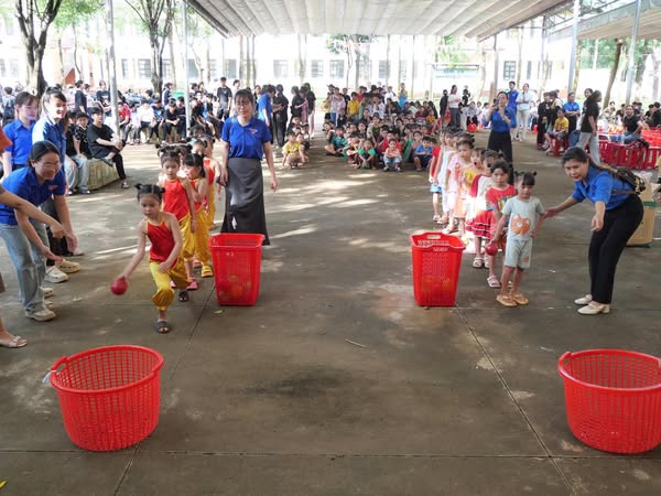 Các trò chơi như ném banh vào rổ, bịt mắt đập chuông, chiếc ghế âm nhạc được chuẩn bị chu đáo, thu hút đông đảo các em nhỏ tham gia. Tiếng reo hò cổ vũ, tiếng cười rộn ràng vang khắp sân trường, tạo nên không khí Trung thu thật náo nhiệt và ấm áp.