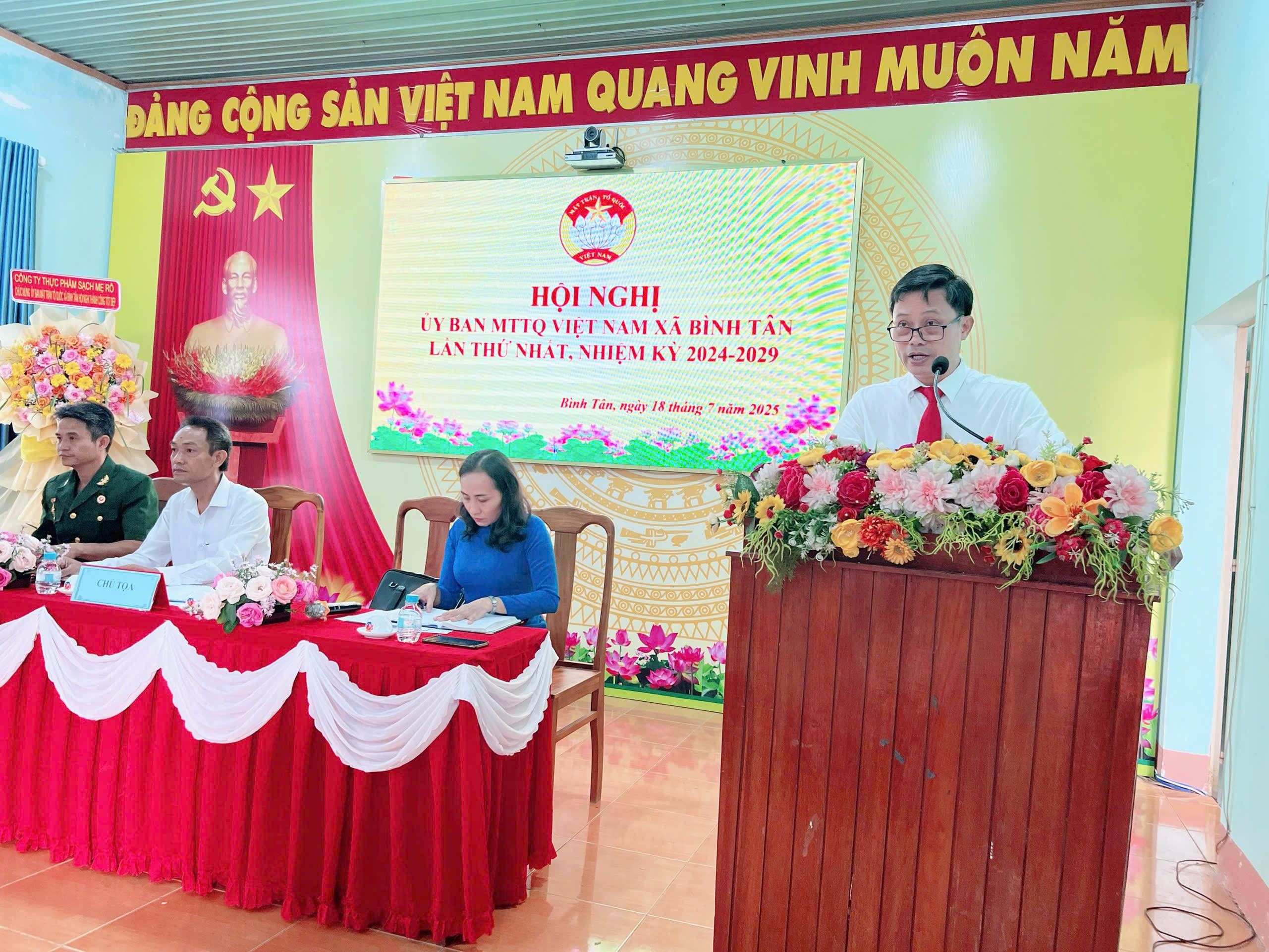 Tại hội nghị, đồng chí Trần Mạnh Tuyển – UV.BTV, Chủ tịch UBMTTQ xã đã công bố Quyết định thành lập và công nhận danh sách ủy viên Ủy ban MTTQ Việt Nam xã Bình Tân nhiệm kỳ 2024–2029. Hội nghị đã biểu quyết 100% thống nhất thông qua quy chế hoạt động, cơ cấu tổ chức và Nghị quyết hội nghị lần thứ nhất.