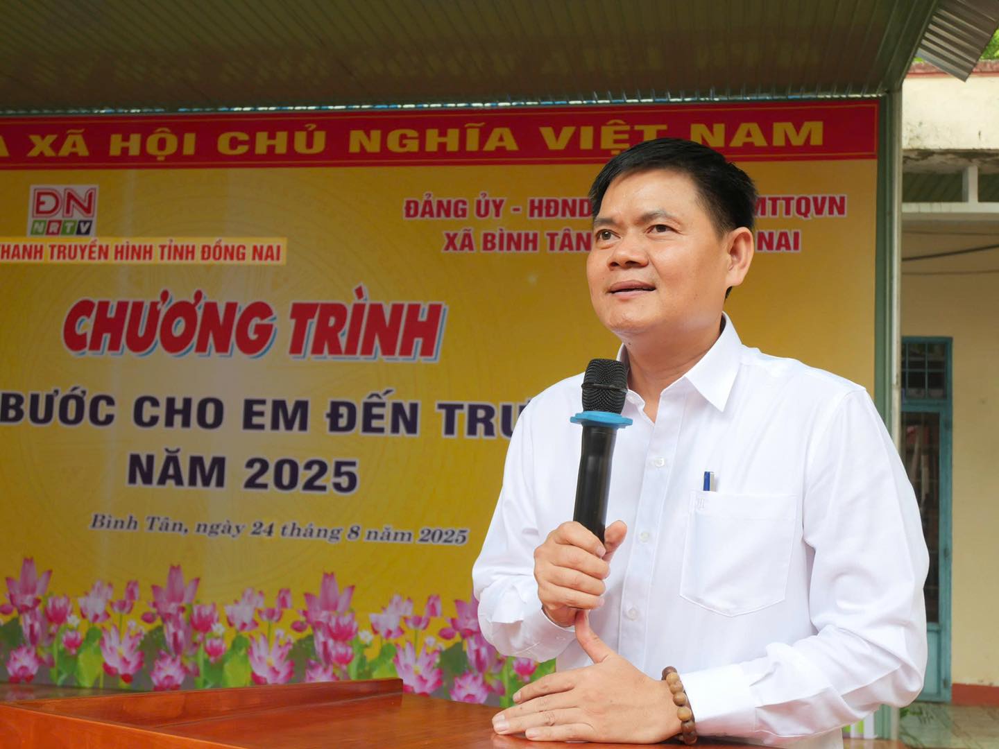 Sáng 24-8, xã Bình Tân tổ chức chương trình “Tiếp bước cho em đến trường” năm 2025 – hoạt động thường niên đầy ý nghĩa nhằm chia sẻ khó khăn, tiếp thêm động lực cho học sinh nghèo trước thềm năm học mới.Tham dự chương trình có ông Lâm Văn Phương – Trưởng phòng Thư ký biên tập Báo và Phát thanh Truyền hình Đồng Nai, bà Nguyễn Thị Thanh Nhàn – Thư ký Chi hội Nhà báo.