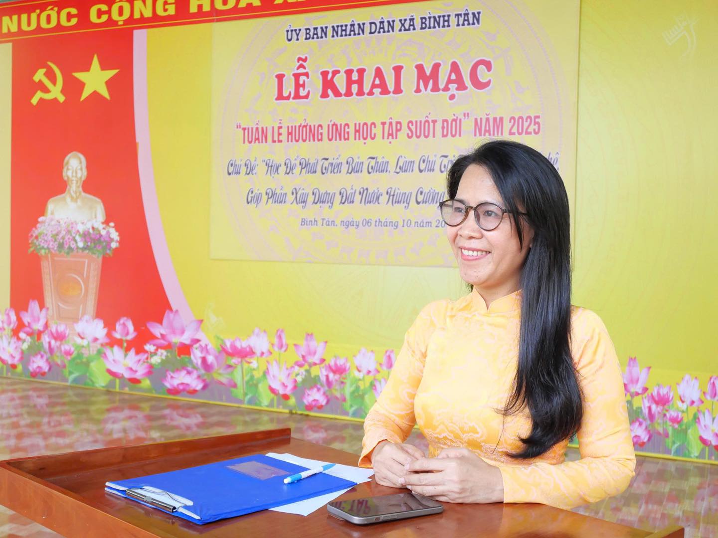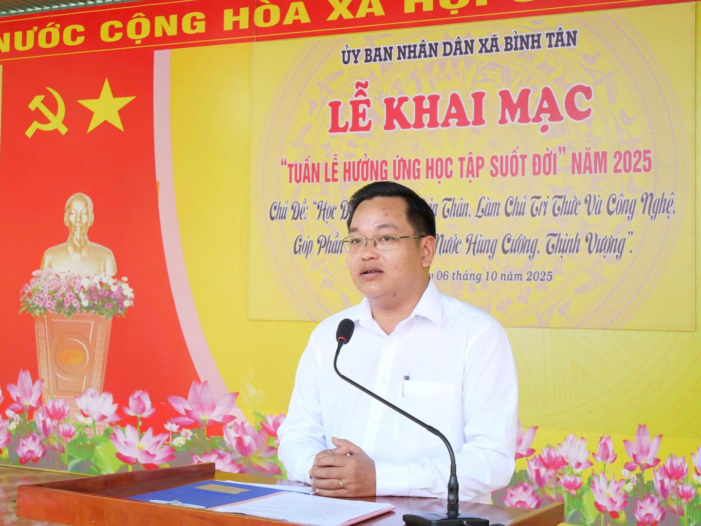 Phát biểu khai mạc, đồng chí Doãn Thị Mai Xuân – Phó Bí thư Đảng ủy, Chủ tịch UBND xã nhấn mạnh ý nghĩa to lớn của Tuần lễ hưởng ứng học tập suốt đời, khẳng định việc học không chỉ dừng lại trong nhà trường mà phải được duy trì thường xuyên, liên tục trong suốt cuộc đời. Đồng chí kêu gọi toàn thể cán bộ, công chức, viên chức, người dân và học sinh xã Bình Tân tích cực học tập, rèn luyện, làm chủ tri thức và công nghệ, góp phần xây dựng xã hội học tập vững mạnh, hiện đại.
