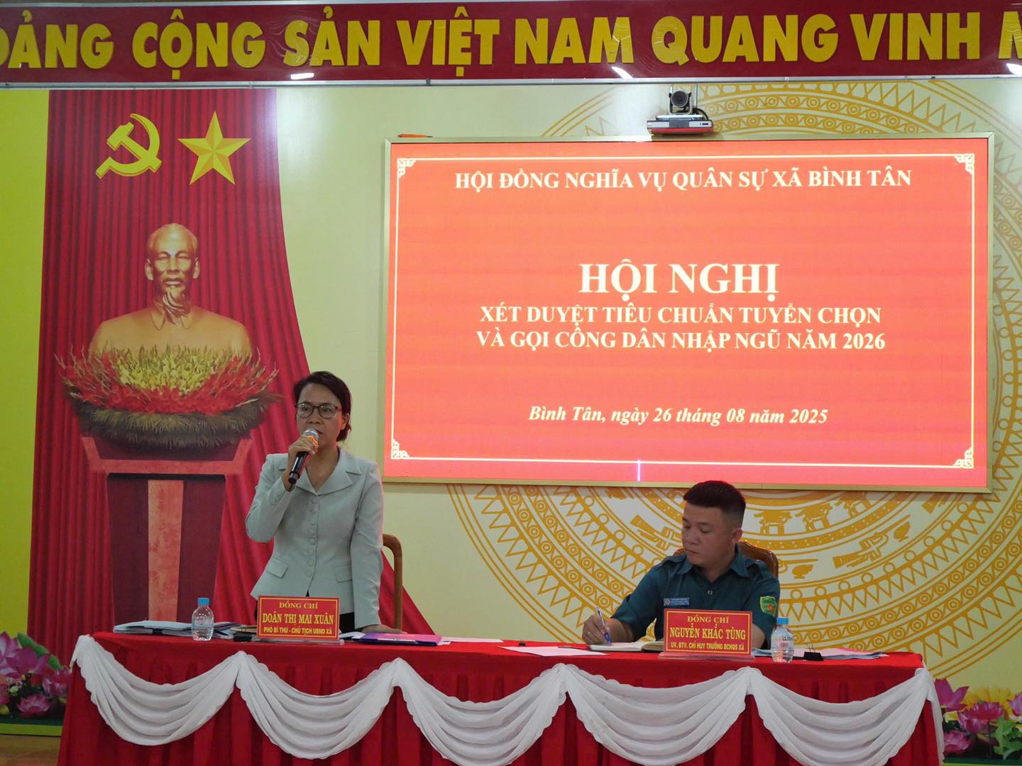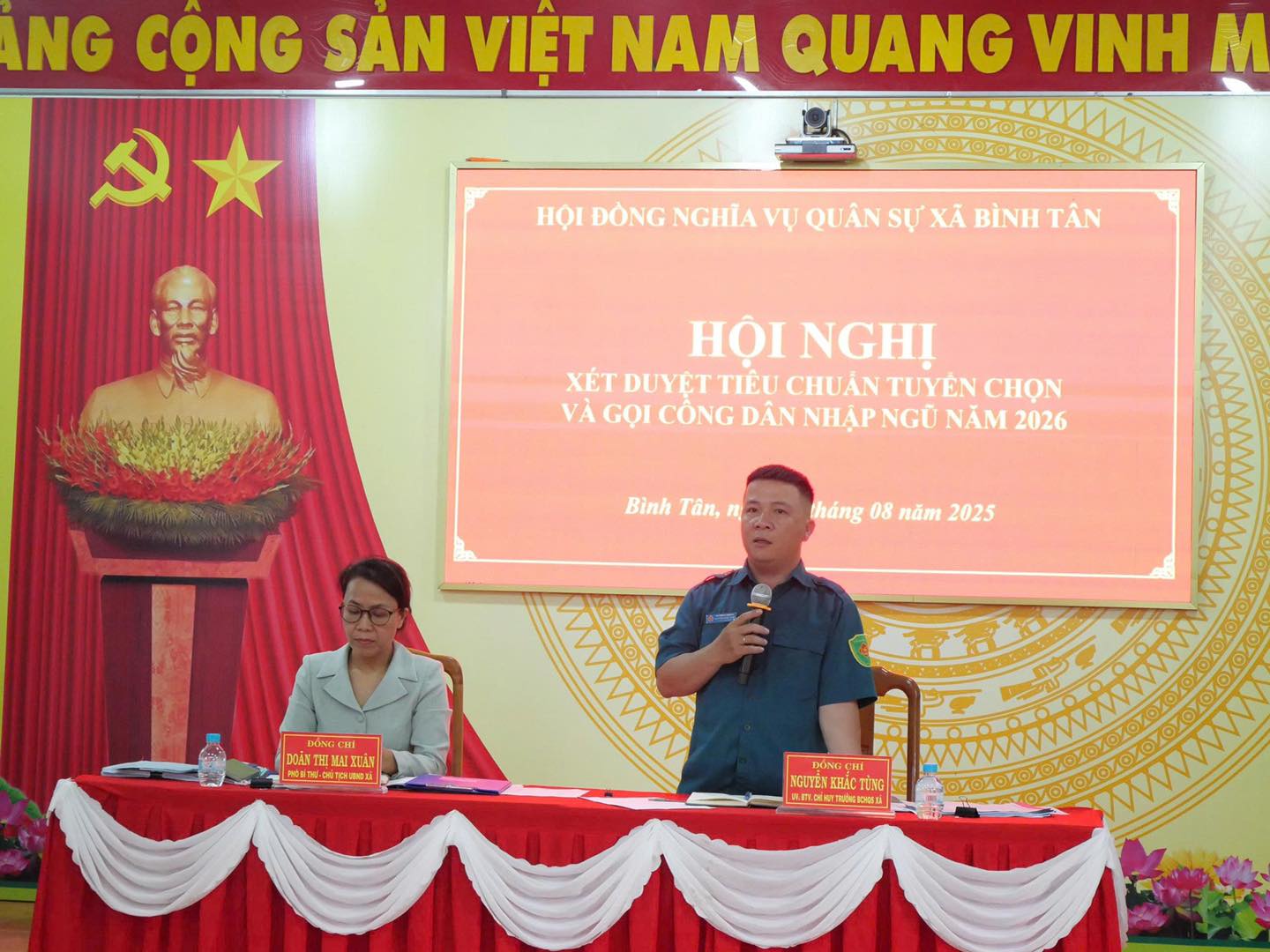 Sáng 26-8, Hội đồng Nghĩa vụ quân sự (NVQS) xã Bình Tân tổ chức hội nghị xét duyệt tiêu chuẩn tuyển chọn, gọi công dân nhập ngũ năm 2026. Đồng chí Doãn Thị Mai Xuân – Phó Bí thư Đảng ủy, Chủ tịch UBND xã và đồng chí Nguyễn Khắc Tùng – Ủy viên BTV, Chỉ huy trưởng Ban CHQS xã đồng chủ trì hội nghị.