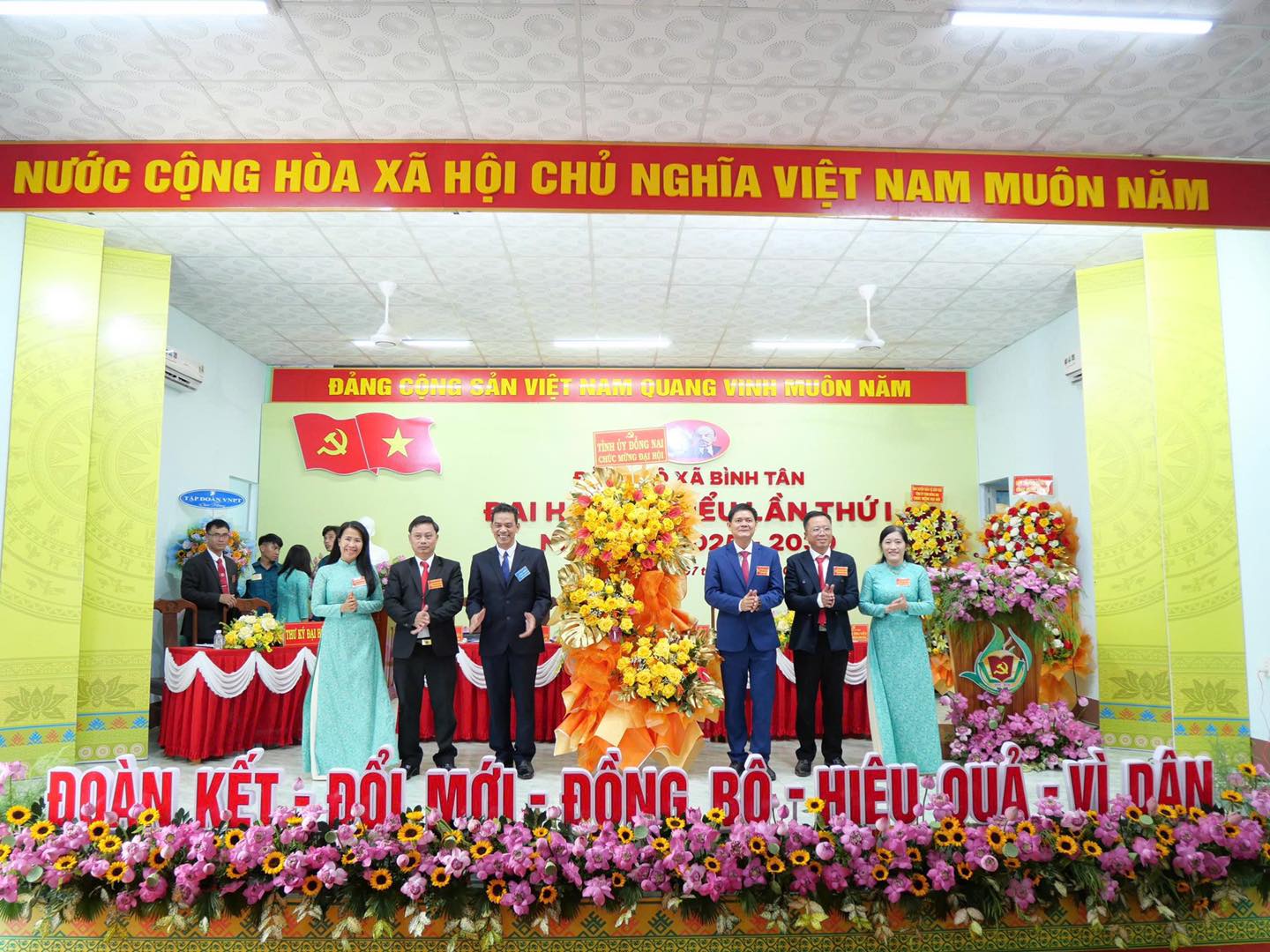 Phía xã Bình Tân: đồng chí Nguyễn Bá Việt – Bí thư Đảng ủy, Chủ tịch HĐND xã; đồng chí Lê Văn Đông – Phó Bí thư Thường trực Đảng ủy; đồng chí Doãn Thị Mai Xuân – Phó Bí thư, Chủ tịch UBND xã; đồng chí Trần Mạnh Tuyển – Ủy viên Ban Thường vụ, Chủ tịch Ủy ban MTTQ Việt Nam xã; đồng chí Mai Thị Thuyết – Trưởng Ban Xây dựng Đảng điều hành Đại hội.