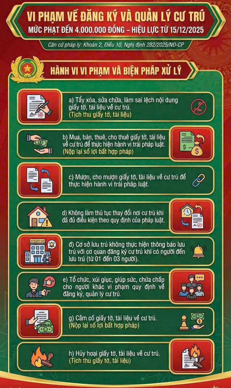 – Áp dụng từ 15/12/2025 Căn cứ Nghị định số 282/2025/NĐ-CP, từ ngày 15/12/2025, các hành vi vi phạm quy định về đăng ký và quản lý cư trú sẽ bị xử phạt hành chính, trong đó mức phạt tiền có thể lên đến 4.000.000 đồng.